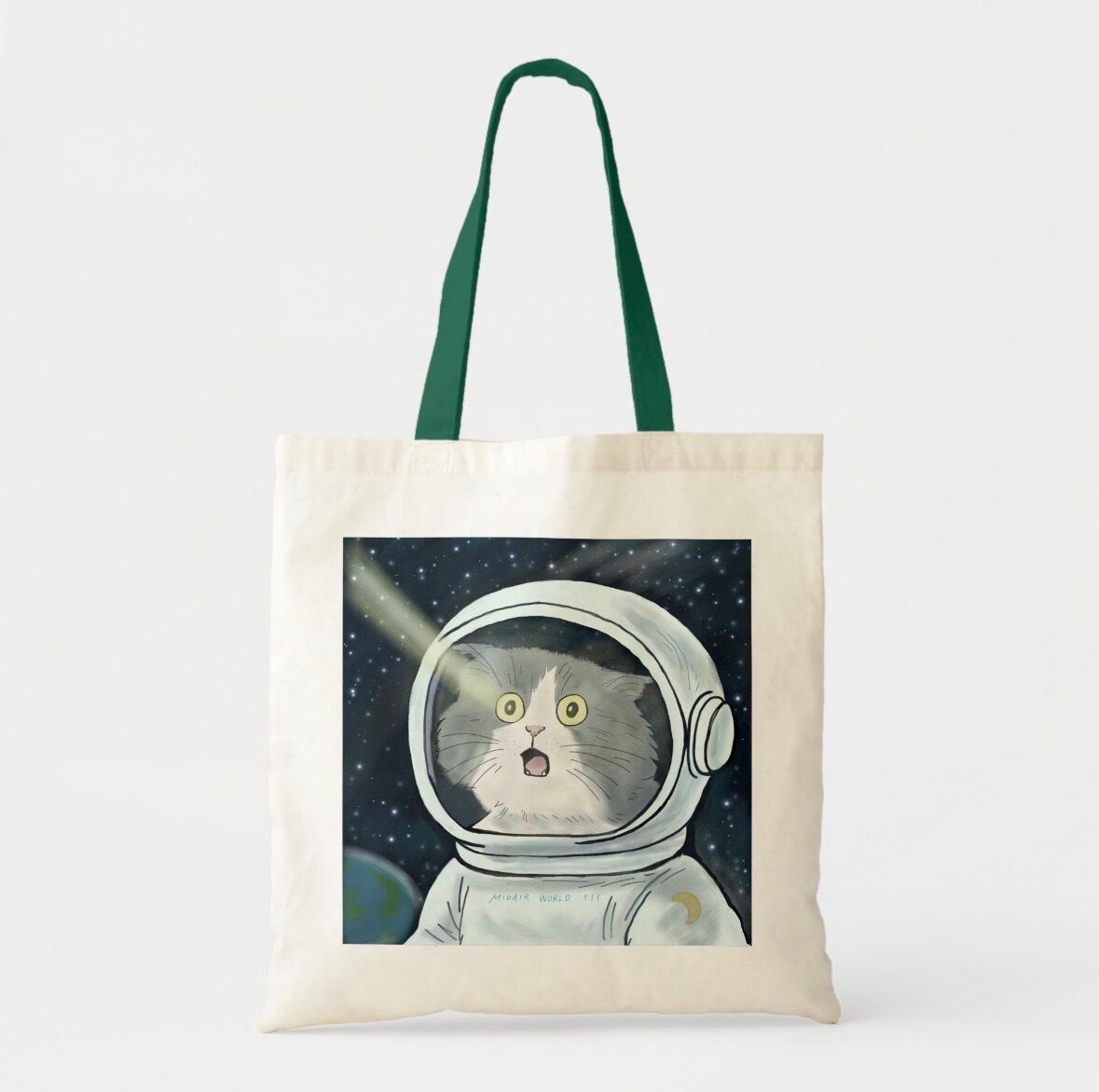 毎日のお出かけに便利なトートバッグ。たっぷりとした収納力と、個性的な宇宙猫デザインで、周囲の注目を集めること間違いなし!